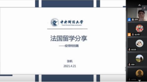 April 22nd, CUFE Business School held the Overseas Studying and Life Sharing online meeting series, aiming to provide guidance to study abroad to undergraduate students. Mr.Zhang Fan, alumna studying for master's degree at ESSEC Business School in Paris, France, was invited to give the presentation. Ms. Wang Tingting and Ms. Wang Huiting from CUFE Business School attended the meeting. Mr.Zha...