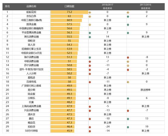 2018年中国消费金融口碑综合指数排名及变化