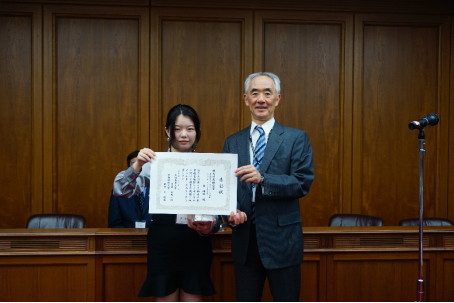 大阪商业大学校长谷冈一郎教授向awc777万象城娱乐官网学生窦梅枝颁奖