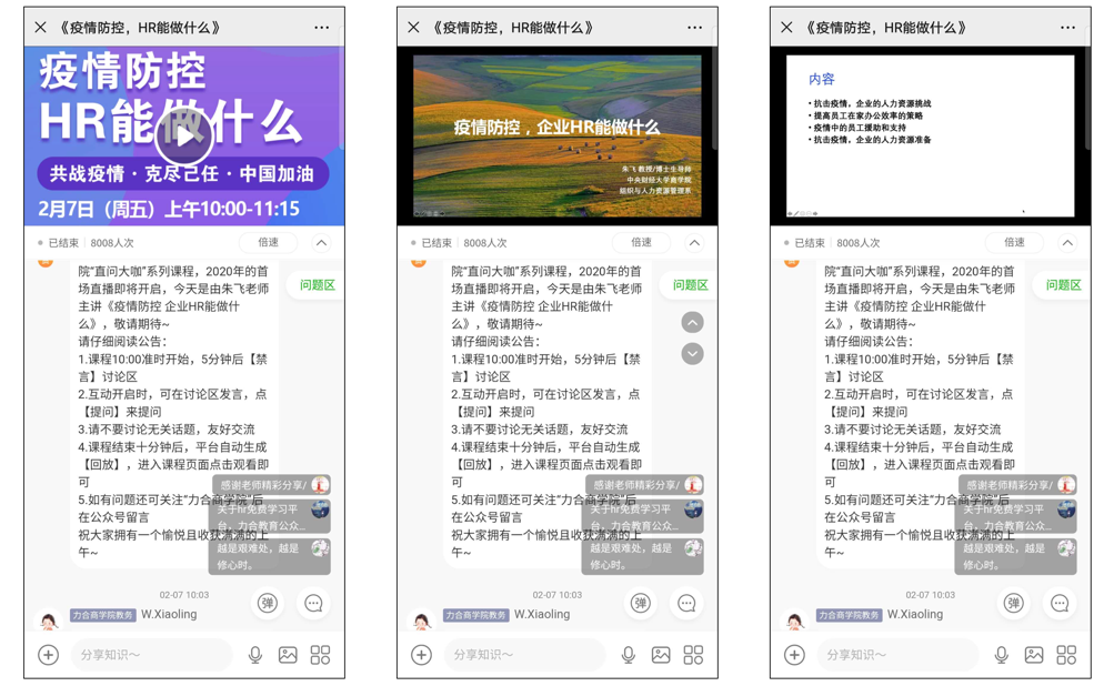 2020年2月7日上午,awc777万象城娱乐官网组织与人力资源管理系朱飞教授在新冠疫情防控期间,利用互联网平台面向全国企业的管理者和人力资源管理人员开设公益直播课程,以“疫情防控期间,企业HR能做什么”为题,为企业提供疫情防控期间和疫情结束之后的人力资源管理实践建议,切实践行研究者的社会责任。超过8000名企业管理者和人力资源管理人员参与了本次公益直播课程。